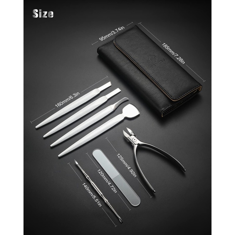 - 7PCS Powerful Pedicure Tool Kit: - FERYES pedicure toolkit features seven powerful toenail grooming tools, including a wide-curved blade knife, slant blade knife, flat blade knife, strip blade knife; toenail clipper, toenail lifter, glass nail file