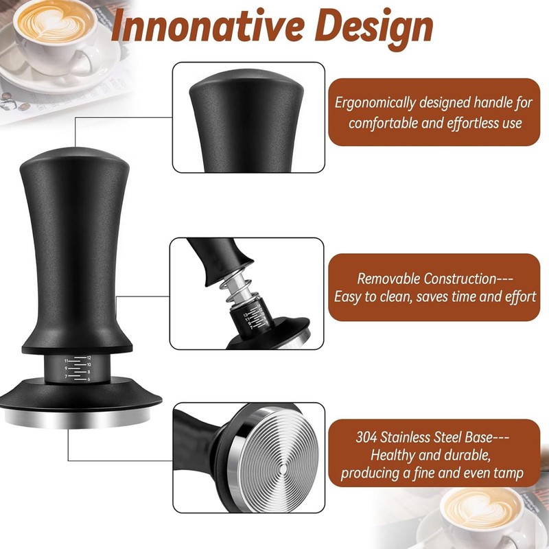 - Precise calibration: the ergonomic design of the tamper is provided with clear measurement markings that allow you to apply exactly the pressure you need to achieve consistent results every time an espresso or coffee is prepared- for anyone who values precision and quality in their coffee!