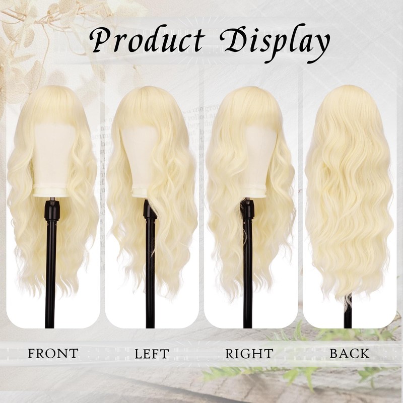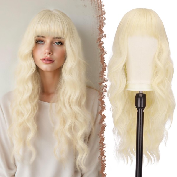 FESHFEN Long Blonde Wig with Fringe for Women Natural Synthetic Wavy Curly Wavy Hair Heat Resistant Women's Wigs for Daily Party Cosplay Carnival 65 cm
