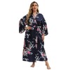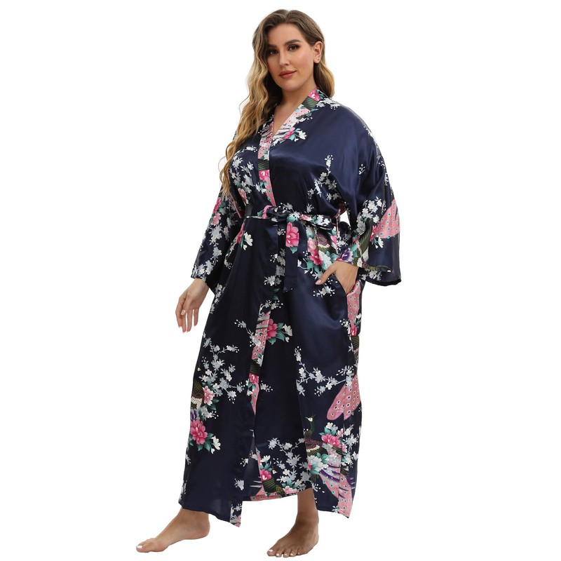 feslieacc Women's Floral Long Satin Robes Plus Size Long Silk Robes Peacock Floral Kimonos Sleepwear Dressing Gown, Peacock | Navy, 4X-Large-5X-Large Plus