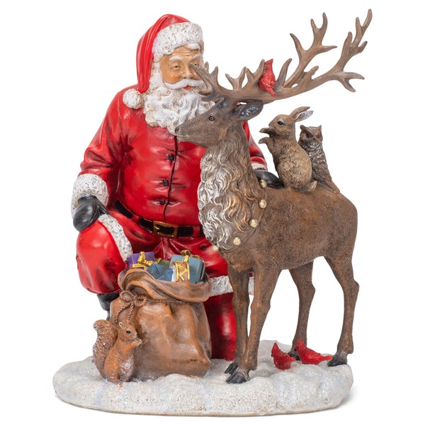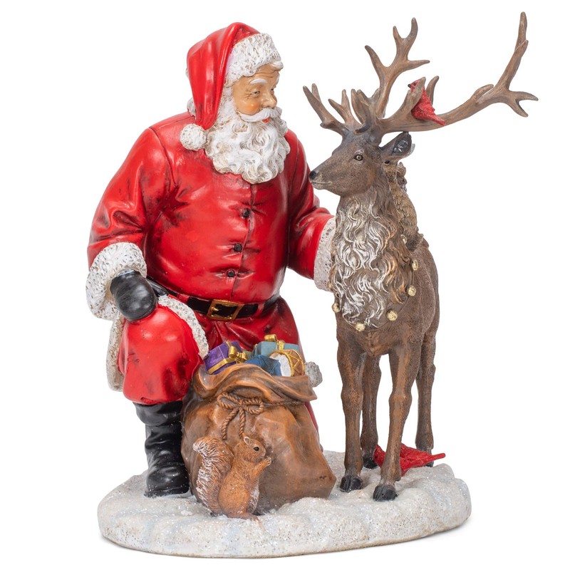 - Decorate for the holidays with this festive figurine; Featuring Santa petting a reindeer surrounded by woodland animals; Beautifully accented with silver glitter