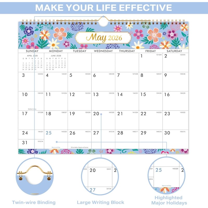 - INK RESISTANCE THICK PAPER - The 2026 calendar is made of premium thicker paper, so that plan your schedule without fear of ink bleeding through. Besides, strong metal twin-wire binding with hanging loop facilitates turning pages and hanging on the wall easily.
