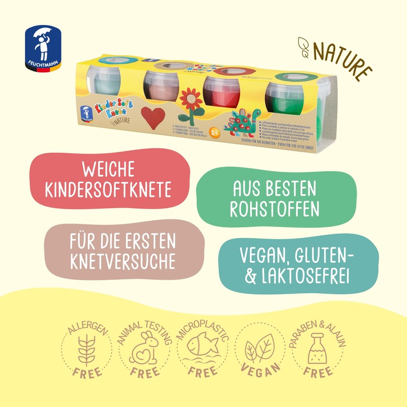 - Soft: wonderfully soft modelling clay that especially inspires toddlers. The Feuchtmann children's soft dough is perfect for crafts, for first kneading attempts and is ideal for the kneading press.