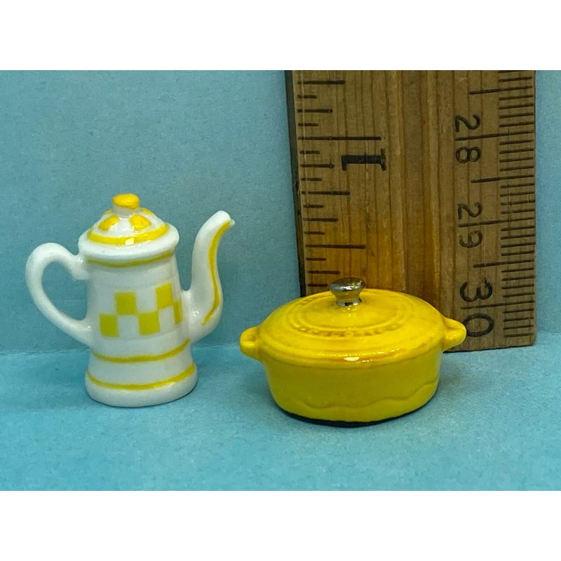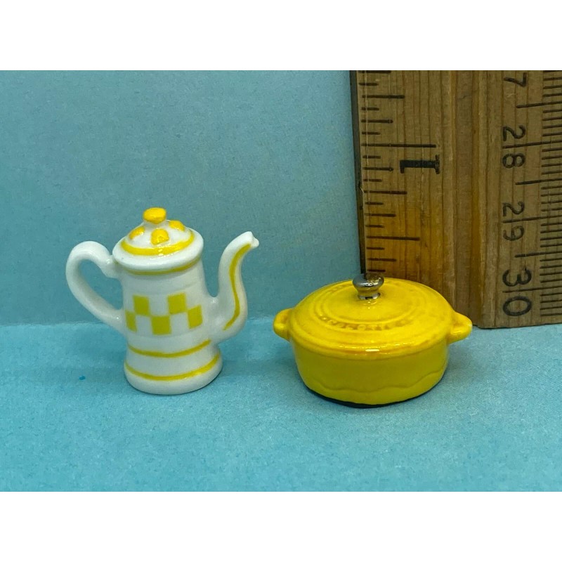 YY101 You get both pieces. Lovely porcelain dutch oven and checkered coffeepot - these are solid pieces, the lids do not come off. Please see ruler in photos for size - these are miniatures - the coffee pot is just under 1" tall. This checkered design is a traditional French Enamelware design.