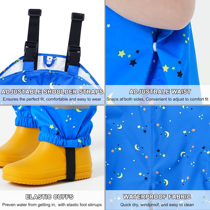 - Comfortable fit: With elastic shoulder straps and snap buttons at the sides, while the over-the-shoulder bib design stays in place during active play. Our toddler rainpants offer a flexible and adjustable fit, allowing for unrestricted movement and all-day comfort.
