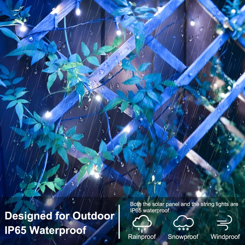 - 🔆【Easy to DIY & Waterproof】Solar string lights is made with flexible upgraded quality wire, won't broken, won't be knotted, you can easily DIY unique dinner party or flowers; making twinkling plants arrangement. With IP65 waterproof performance, the solar fairy lights outdoor can withstand any weather, also suitable for outdoor use without any worry of short circuit or weather damage.