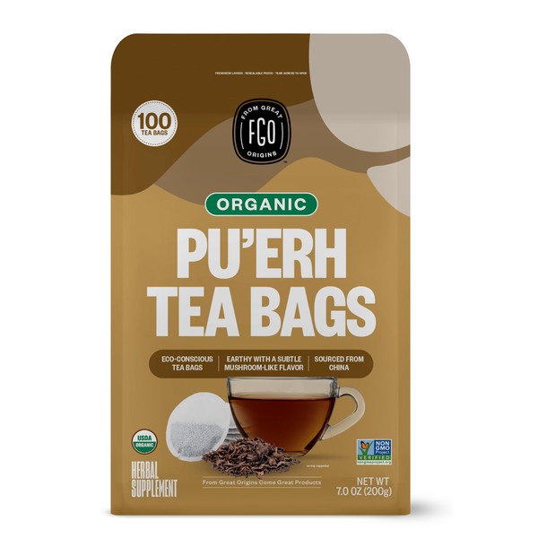 FGO Organic Pu'erh Tea, 100 Count, Eco-Conscious Black Tea Bags, Resealable Bag, Packaging May Vary (Pack of 1)