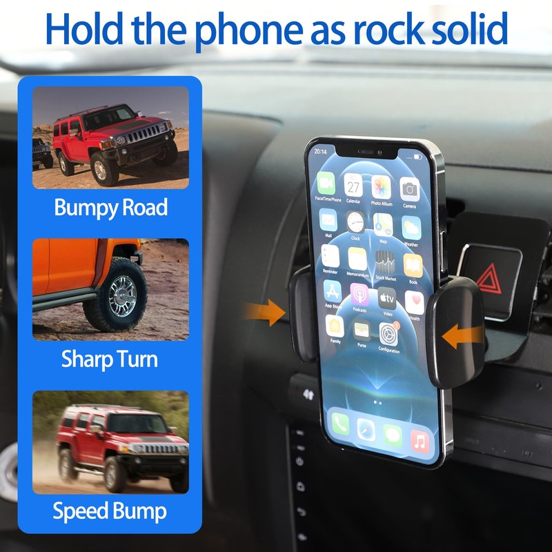 - STURDY & STABLE: The base of cell phone holder adopt hollow out design that is perfect integration with center console air vent. Our car phone mount with clamping arm, holding your device firmly while you drive. It can safely hold the device without vibrating and wobbling even on rough roads.