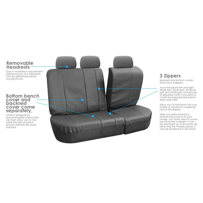 - Package includes: 4 front low back bucket covers 1 rear backrest cover 1 rear bottom bench cover 7 separate headrest covers.