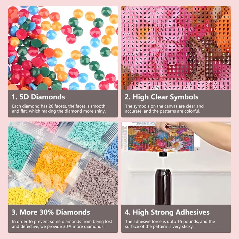 - 【CONTAIN ALL TOOIS】: Diamond painting kits contain all tools:1*HD canvas, 1*set drill bags, 1*drill pen, 1*jelly glue, 1*tray, 1*9 beads pen tips, 1*3 beads pen tips, so you don’t need to purchase any additional tools. And all diamonds are provided 30% more than needed