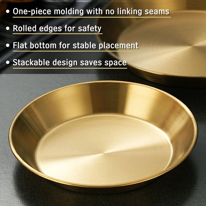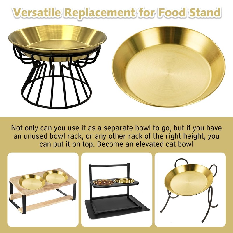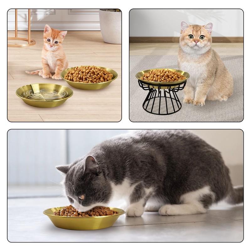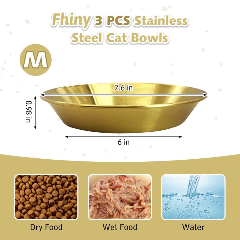 Fhiny 3Pcak Basic Cat Bowls, Stainless Steel Cat Dish Gold Dog Food Bowl Metal Whisker Friendly Wide Shallow Pet Feeder Plate Replacement Bowl for Stand Easy to Clean for Kitten Puppy (M:7.6in)