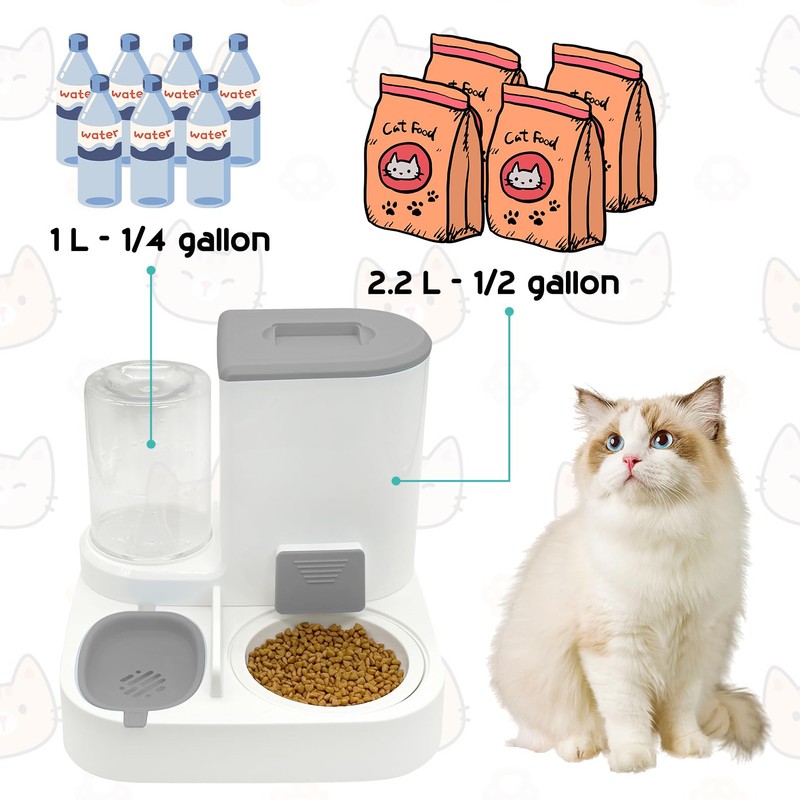 - 🐱【Large Capacity】: Cat food dispenser can hold 1/2 gallon of dry cat food and 1/4 gallon of water, the water bottle uses the gravity siphon principle and the water stops automatically when it reaches a predetermined location. Feeder spout 45 ° tilt, 2.5 inches wide smooth not stuck food.
