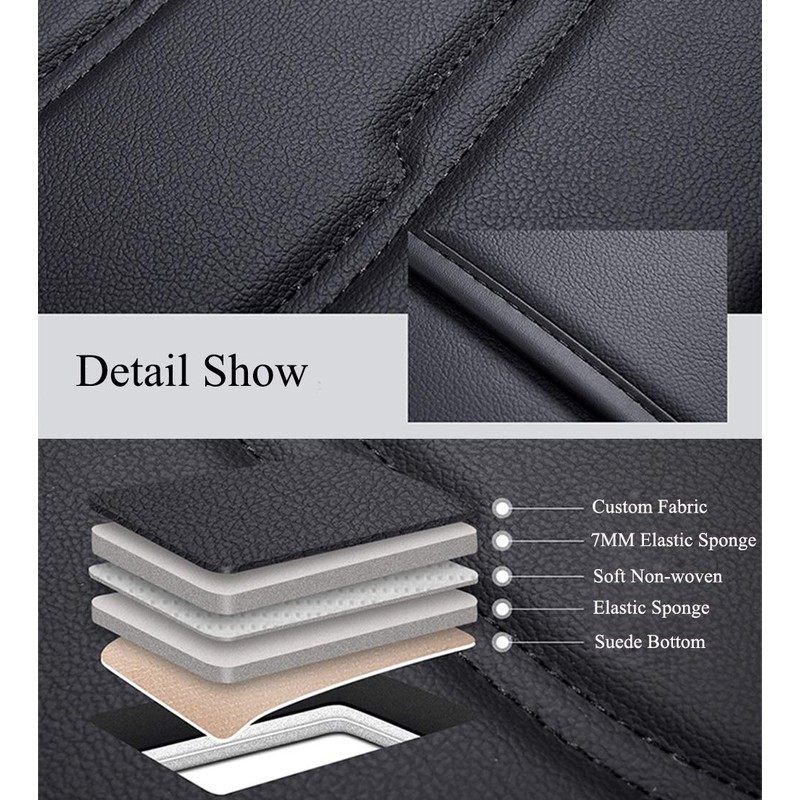 - Surface layer is good quality 0.9mm thick artificial leather,more wear-resisting but still soft touch.Center sponge layer is 9mm thick keeps the covers in good shape after long time use, and sit in feeling like a foam surrounding.Bottom layer is suede like fabric cloth,gently protect the seats.For the back bench,anti-slip sillica gel dots bottom layer,keeps the cushions in place when get in and out.