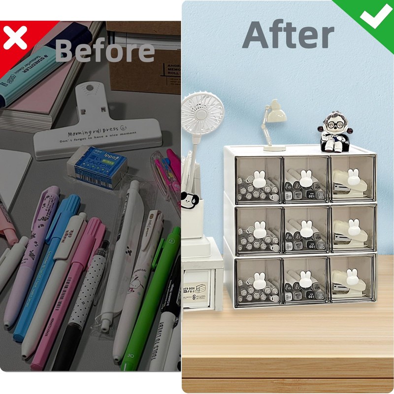 - 【Premium Quality Material】: The 3 drawer storage organizer is made from high quality plastic which is both lightweight and sturdy. The rabbit shaped handles ensure that the drawers open and close easily for long term use. The desk organiser is also waterproof and easy to clean. Its transparent design allows you to quickly see what's inside