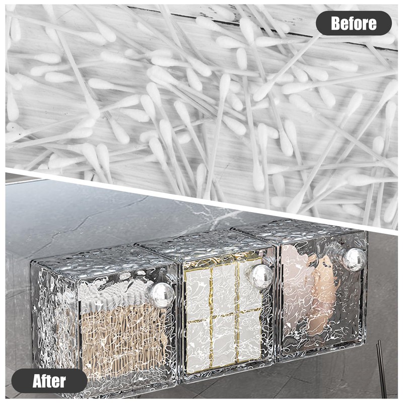 - 【Package Includes】:You will receive three makeup cotton storage box, each with a non-marking sticker. Our qtip holder measure approximately 3.46 x 3.43 x 3.74 inches/8.8 x 8.7 x 9.5 centimeters, which helps you to categorize your small items, with plenty of capacity to utilize the vertical storage space for your needs.
