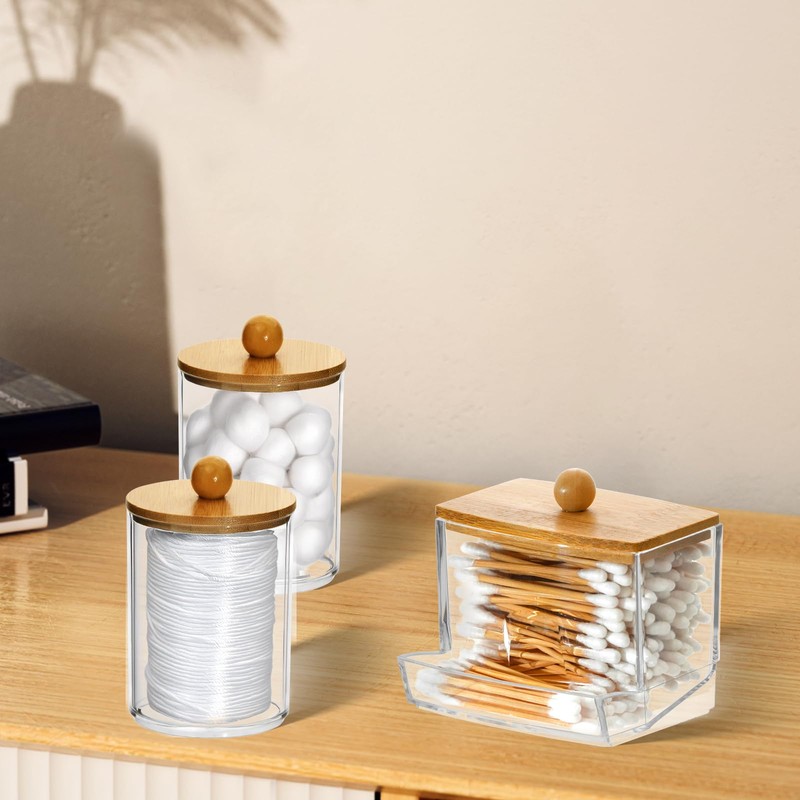 - 【Powerful Storage Function】:These qtip holder bathroom sets are ideal containers for organizing small items in the bathroom, perfect for storing cotton balls, cotton swabs, makeup sponges, hair ties, floss sticks, toothbrush heads, makeup brushes, beauty eggs, face sponges, cotton swabs, beauty eggs, pens, clips, and other small items. Fashionable and transparent appearance, no need to worry about color matching, suitable for many scenes, such as bathroom decoration, restroom decoration, bedroom, kitchen, office, etc.