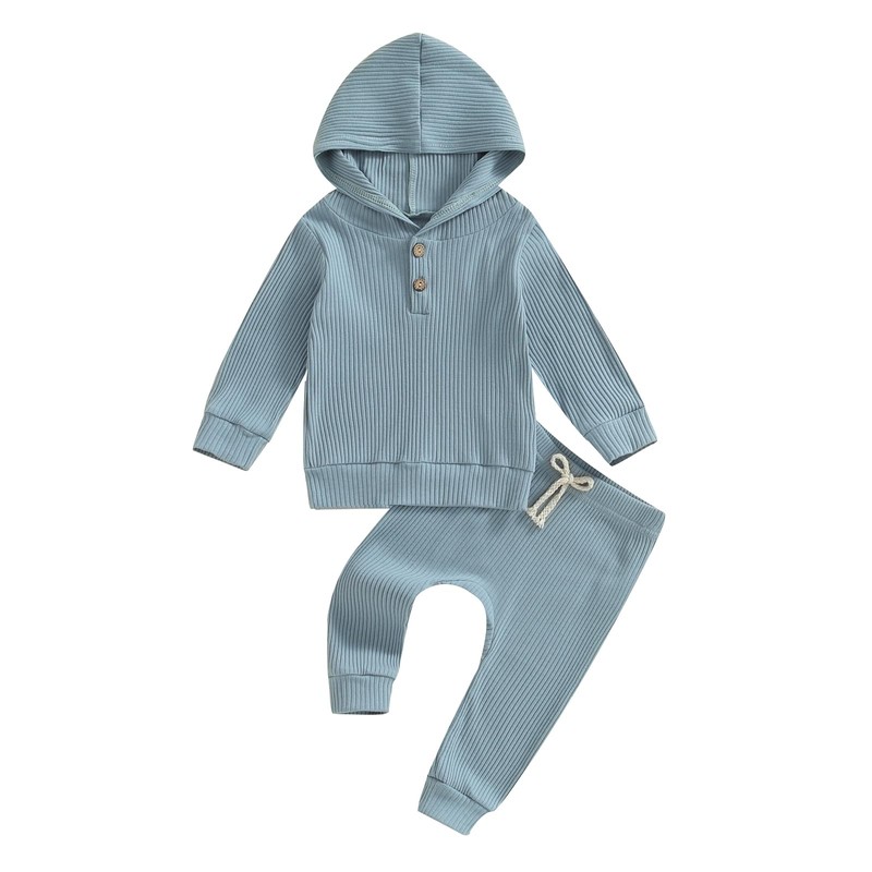 - Infant girl boy long sleeve ribbed cotton hoodie, elastic pants 2pcs clothes set, hoods can keep the head warm, there are two buttons on the collar, multiple solid color set options: blue, brown, green, army green, beige, gray.