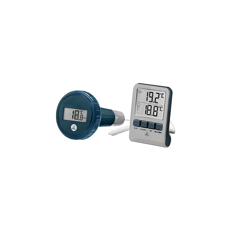 • Wireless transmission of water temperature via up to 3 pool transmitters: It consists of a reception set with display (98 x 70 x 22 mm) and a floating transmitter (diameter 80 x 115 mm) with built-in stainless steel temperature sensor. The float transmitter measures the water temperature (-20...+ 60°C or -4... + 140°F) and sends it to the receiver where the transmitted water temperature and air temperature (-10...+60°C or 14... +140°F) can be read.