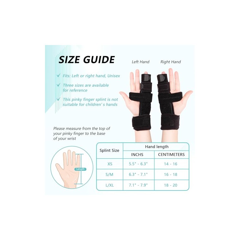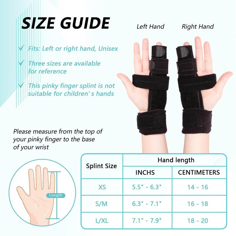 - SIZE GUIDE The finger splint for pinky are available in three sizes. Please measure from the top of the ring finger to the base of the wrist to choose the right size. XS: applicable distance between 5.5-6.3 inches(14-16cm); S/M: applicable distance between 6.3-7.1 inches(16-18cm); L/XL: applicable distance between 7.1-7.9 inches(18-20cm). The finger splint fits for men and women, either left hand or right hand.