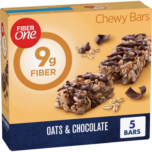 Hearty whole oats topped with a smooth chocolaty drizzle and delicious chocolate chips, Fiber One Oats & Chocolate Chewy Granola Bars provide an indulgent snack without any of the guilt. Rich chocolate chips and hearty oats help satisfy your cravings without sacrificing your healthy lifestyle. Each fiber bar contains at least 35% daily value of fiber so you'll feel like one smart cookie when you say 'yes' to your sweet tooth. Diets high in fiber can help keep your digestive system on track. Choose Fiber One Chewy Barrs for your breakfast bars, office snacks or as an on-the-go treat. Contains 5 bars total.