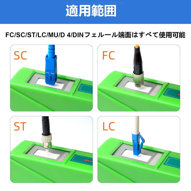 - [Range of Application] Can clean various connectors, such as SC/FC/ST/LC/D4/PU/MT/DIN and other fiber connector ferrule terminal cleaning; Can be used in optical experimental units and indoor and outdoor construction; Fiber optic communication, maintenance and fiber optic equipment