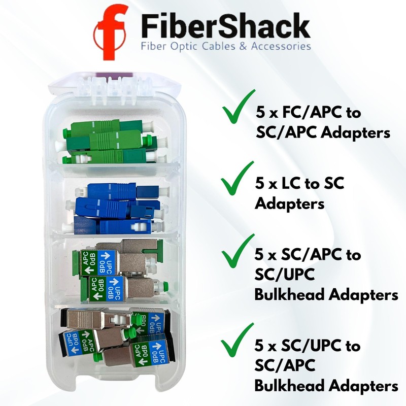 - Contains 4 Fiber Adapters - Fiber optic cable adapter kit is an ideal sm fiber converter - contains 5x SC/APC to SC/UPC & SC/UPC to SC/APC Bulkhead adapters, 5x SC to LC adapters, 5x LC/APC to SC/APC Adapters