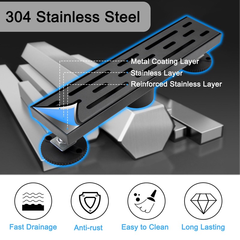 - Adjustable Installation Height: Bathroom rectangle shower floor drain has 2 leveling feet so you can adjust the height to suit your needs