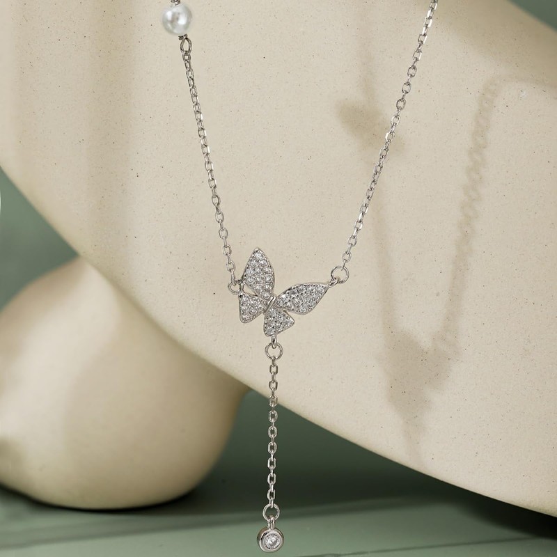 - ❤️ Radiate Style: This necklace showcases a striking 925 Sterling Silver butterfly adorned with Cubic Zirconia and a pearl