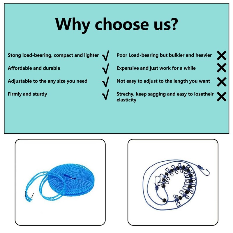 - Packaging: includes 2 pieces of 5 meters long blue portable clotheslines, long enough to meet your daily drying needs. Perfect for camping or any other outdoor activity.