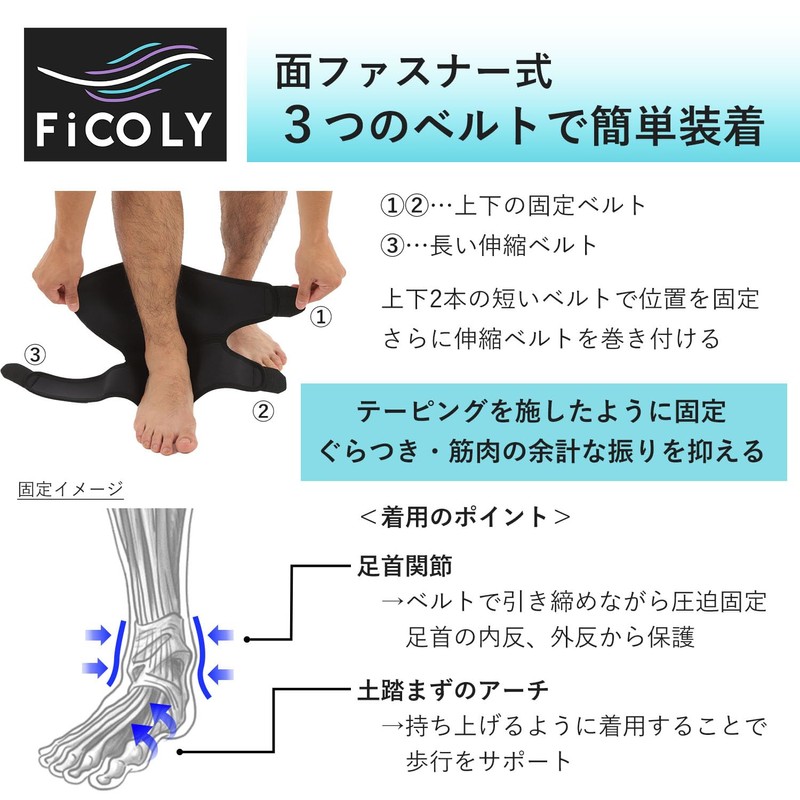 - 【FiCOLY 足首サポーター FFO-2】土踏まずのアーチを持ち上げるように着用することで歩行をサポート、ベルトで引き締めながら圧迫固定することで、足首の内反や外反から保護することができます。伸縮性に優れ、複雑な関節の形に沿って柔らかくフィット、無理なく足首を支えます。仕事、家事など日常生活から、趣味やトレーニングまで、あらゆる場面でお使いいただけます。