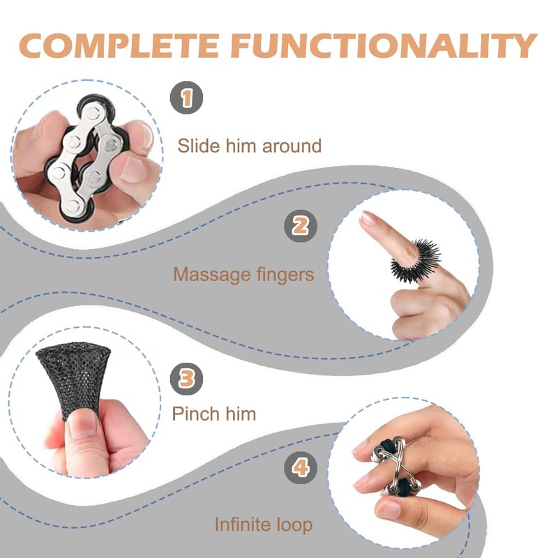 - Fidget toys set: fidget toys adult set includes: 1 x fidget cube, 1 x infinity cube, 1 x pull net, 1 x stress relief chain, 1 x finger massager, 1 x bicycle chain. 6 different anti-stress cubes ensure a pleasant feeling and avoid aesthetic fatigue. You can choose your favourite anti-stress toy that helps you relax, concentrate and create a good mood