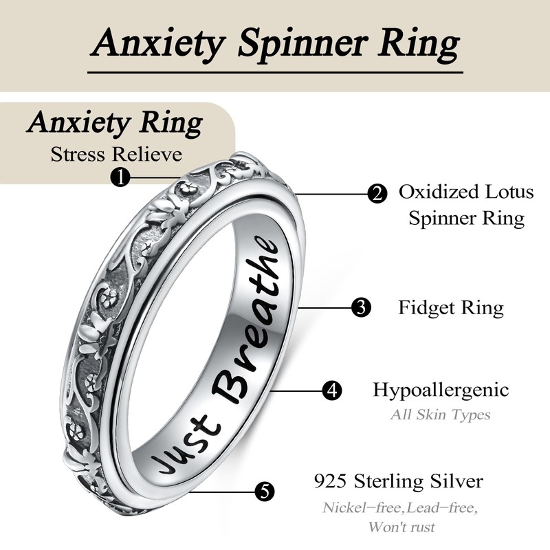 - Lotus-Ringe gegen Stress und Angst: Der oxidierte Lotusring mit der Aufschrift „Just Breathe“ hat die gleiche Wirkung wie die Windmühle, hilft Ihnen bei Stress und Angst und verbessert Ihre Stimmung. Einzigartiger, handgefertigter Ring aus Sterlingsilber, wunderschön verzierter Bandring, auch ein Anti-Angst-Rollspielzeug, das niemand entdecken wird.