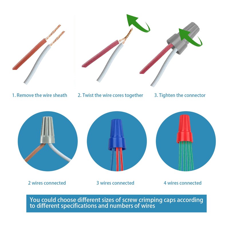 - 【Safety and insulation】 : The wire connector adopts a safety insulated PP material shell to ensure your safety during the wiring process.The insulating flame retardant material plays a role in fire prevention and electric shock, protects heating wires, and reduces hidden dangers.Great for connect wires without soldering!No electrical tape needed.No tools are required for one plug and one twist!
