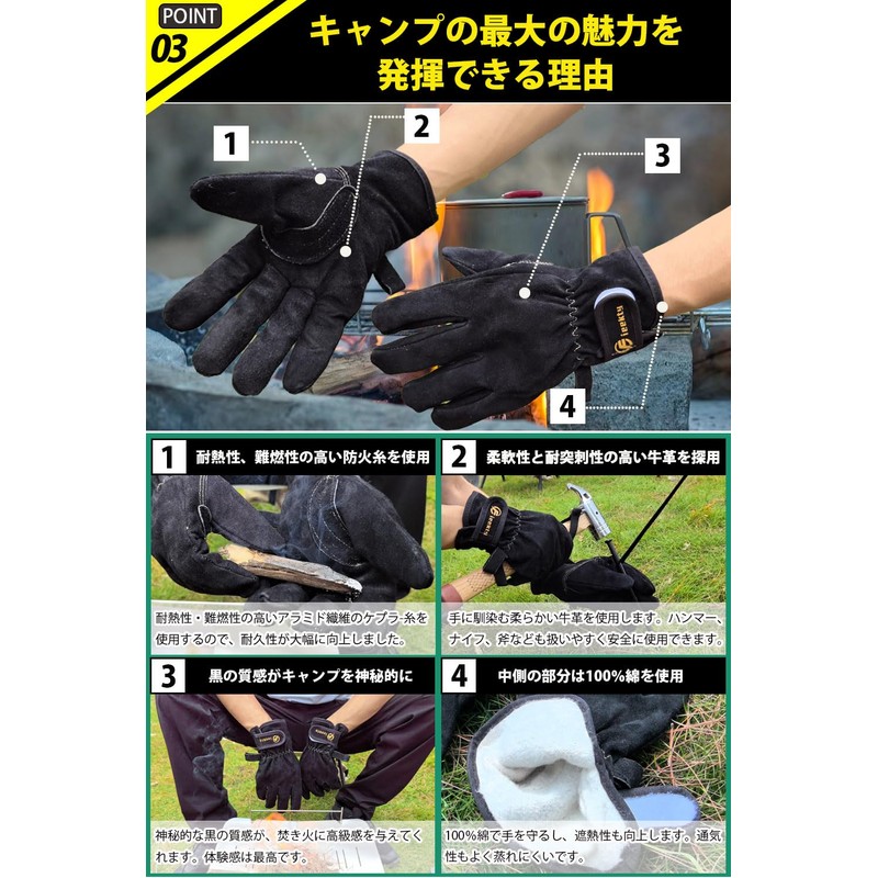 - Campfire Gloves: Made with aramid woven Kevlar yarn that is heat resistant and flame retardant, so the heat resistance has been greatly improved. The base of the thumb is reinforced with leather that doubles as a non-slip feature. Holds items securely in your hand when handling. Velcro type makes it easy to adjust the size of your wrist. Perfect for outdoor camping