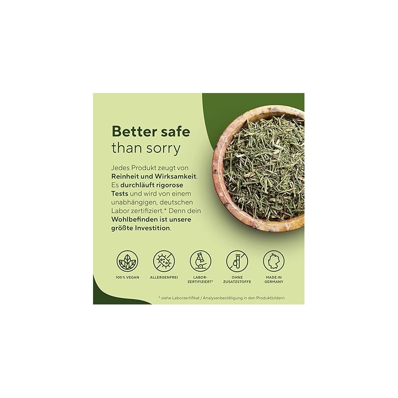 - True ingredients – your field horsetail or horsetail is a premium raw material from China, which is obtained under the highest standards. Despite the purest processing certified on site* (see laboratory certificate / analysis confirmation in the product images), an independent German laboratory the purity of each batch. The raw material is bottled in Germany according to ISO and HACCP standards.
