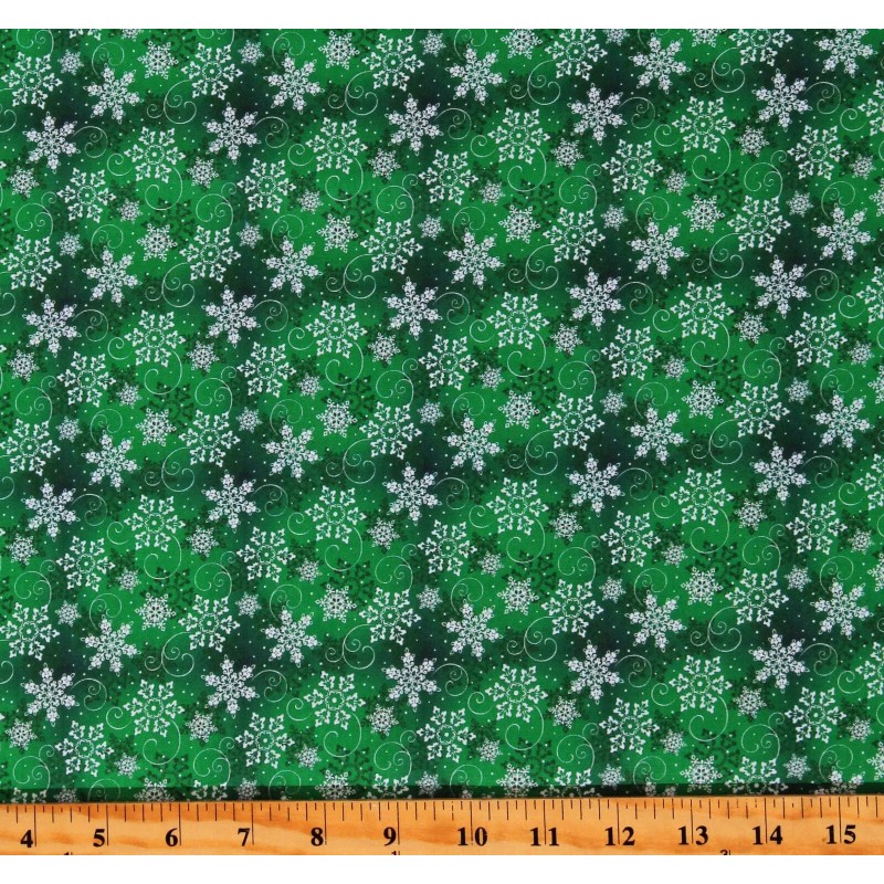 Fields Fabrics Cotton Christmas Snowflakes Snow Swirls Dots Green Fabric Print by Yard D406.56