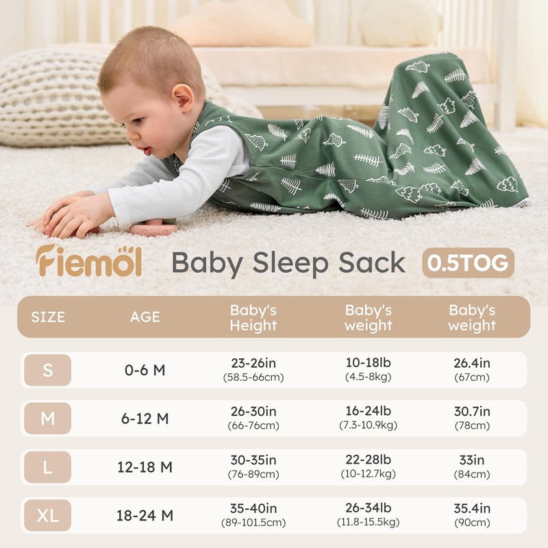 - Cosy Material: The FIEMOL baby sleeping bag is made of premium cotton, which is very soft on baby's delicate skin. Our 0.5 tog baby sleeping bag is lightweight and helps to keep your baby cosy on every summer night.