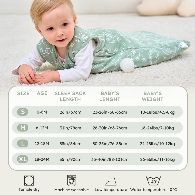 - PREMIUM COTTON The 2.5 tog baby sleeping bag is made of high quality cotton in the outer layer, which can provide your baby with more air circulation. The premium cotton inner layer and microfibre filling ensure a healthy sleep for your baby as they provide both breathability and warmth in winter or mild, cold weather.