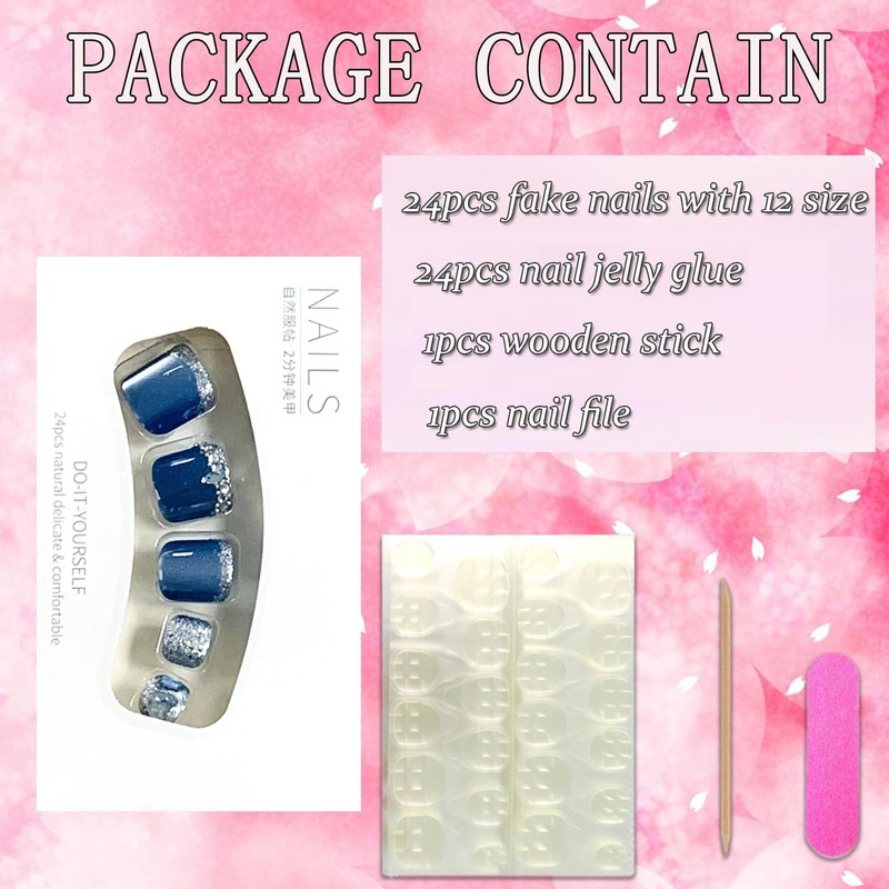 - False Nails Sets:You'll get 24 stick on nails in 12 sizes. 1 mini nail file, 1 small wooden stick, 1 piece of nail glue sticker. Glue on nails are perfect for most people's nails