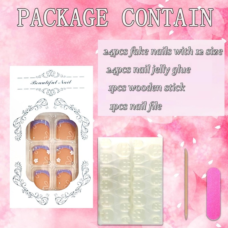 - False Nails Sets:You'll get 24 stick on nails in 12 sizes. 1 mini nail file, 1 small wooden stick, 1 piece of nail glue sticker. Glue on nails are perfect for most people's nails