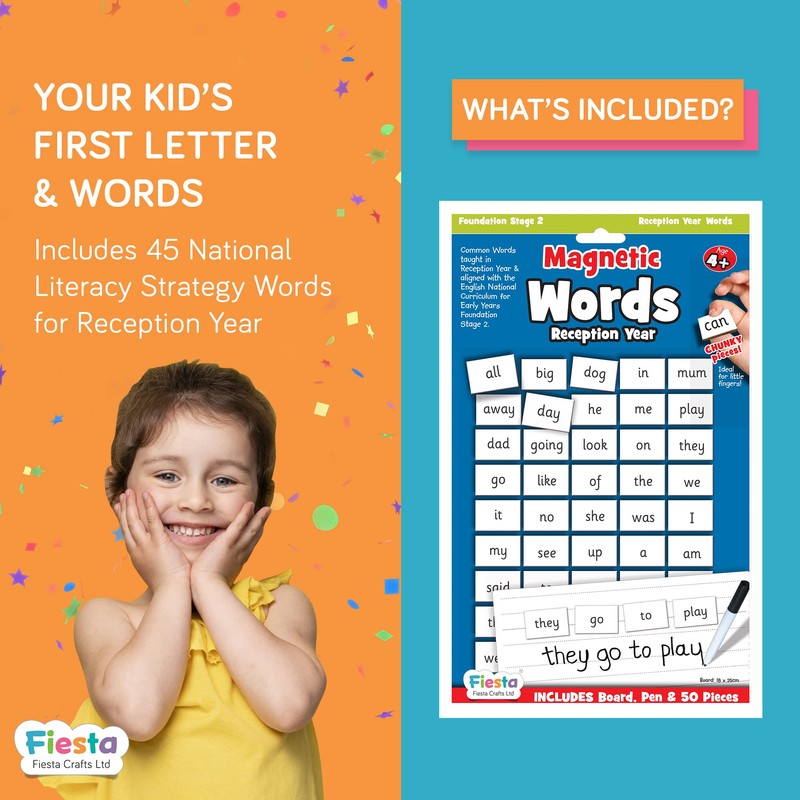 Fiesta Crafts Magnetic Words Reception Year - Learn to Read & Write Magnets for Kids with 50 Word Pieces, Magnetic Board & Dry Wipe Pen - Early Development & Activity Toys for 4+ Year Olds