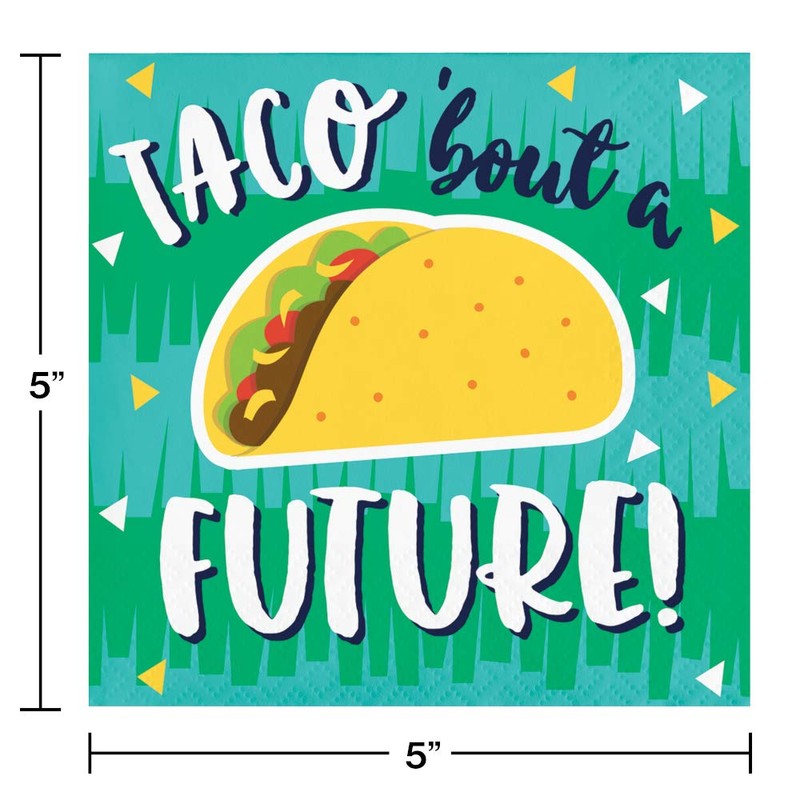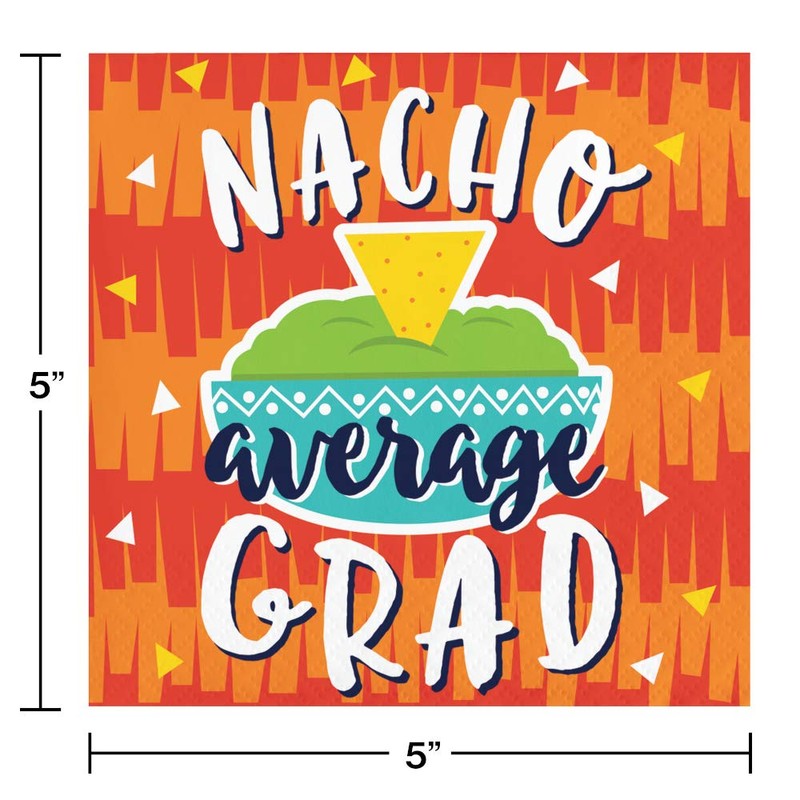 - Bundle of 5 party supply items: (16) paper dinner/lunch plates, (16) paper appetizer/dessert plates, (16) “Taco bout a future” napkins, (16) “nacho average grad” napkins and 1 latex balloon