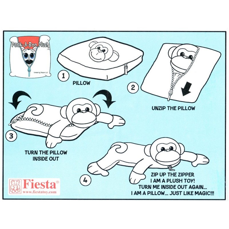 Unzip your Peek a Boo plush, turn inside out for animal or cushion. 2 toys in one for double the fun. Peek-A-Boo Plush is a pillow that unzips and becomes a stuffed animal. Unzip again and the animal becomes a pillow. Soft fabrics and Fiesta features novelty plush and cool toys fun stuff and timeless favorite toys that will provide hours of enjoyment. Fiesta stuffed animals and toys soothe, comfort and encourage creative play. Fiesta was Founded in 1972 in Santa Monica, California. Manufacturing plush for more than 30 years, Fiesta as a company is committed to design innovation, outstanding quality and pricing with superior customer service. Their passion is attention to detail and quality product. Fiesta's plush toys have been bringing smiles to people for many years. The well known red Fiesta bear logo appears on plush teddy bears, dogs n' cats, jungle, sealife, baby, farm, as well as plush novelty items such as backpacks, purses, ride-ons, stick ponies and pillows, signifying fun designs and quality. Fiesta offers realistic and whimsical plush designs for Everyday, Halloween, Christmas, Valentine, Easter, special occasion, baby, graduation, Mother’s Day. Cuddly teddy bears, cats and dogs, horses, sea life, North American, desert life, jungle, birds, farm and exotic animals from all over the world. Fiesta stuffed animals are soft and cuddly these plush toys soothe, comfort and encourage creative play.