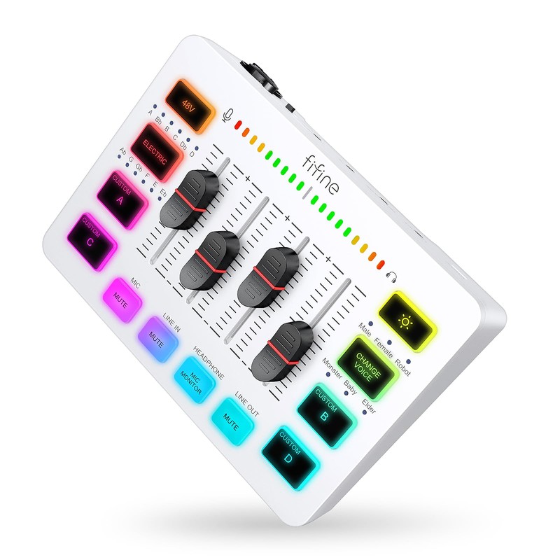 FIFINE SC3W is a white gaming audio mixer for leveling up audio quality. The XLR audio interface and 48V phantom power are set on the podcast mixer, which opens up more choices for condenser microphone, but do not deal with added peripherals. Controllable Vibrant RGB color rotation on gaming mixer, flowing or frozen in a decent pace, presents a greatly strong impression as a "light show" to you. Even a streaming mixer will not be dull looking when video production. Audio mixer, monitored by headphone jack and muted via the front mute button, gives Real-time feedback between speaking and hearing and prevents background noise from damaging your live broadcast. If the volume from headphone or mic to loud or low in gaming, you can control it from 4 faders or mute your voice individually with mute buttons. Four pre-recorded customized buttons on the pc audio mixer can be recorded and activated at the press of button to save more time post production. 6 kinds of voice changing modes and 12 auto tunes will make you even more mysterious on social media like discord.
