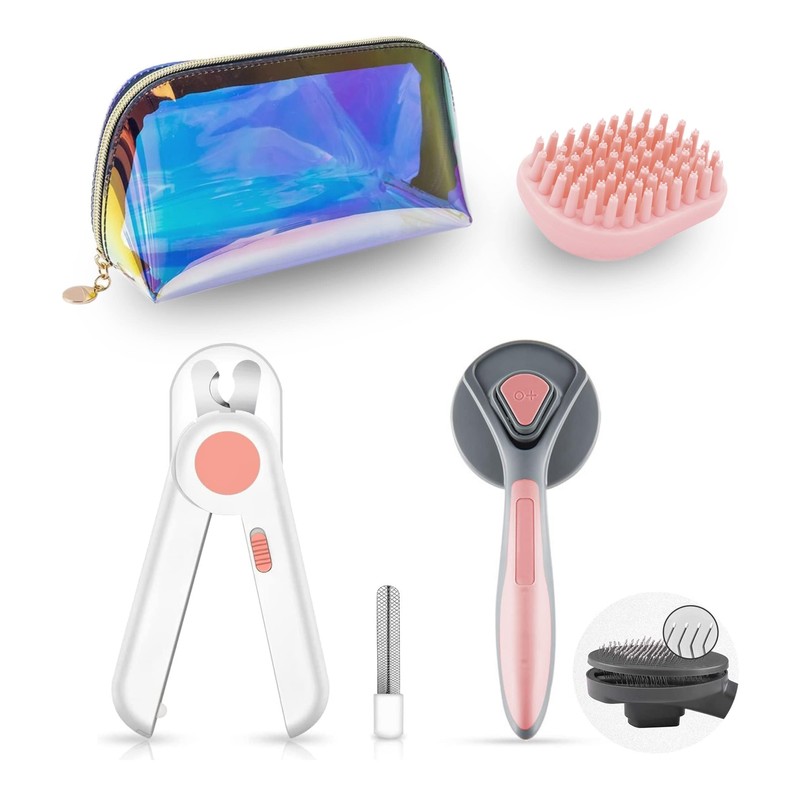 FIFIPETS 3 in 1 Pets Grooming Set, Nail Clippers with Nail File & LED Light, Self Cleaning Shedding Massage Comb, Massage Bath Brush and TPU Bag, for Medium and Small Dogs Cats (Pink Pack)