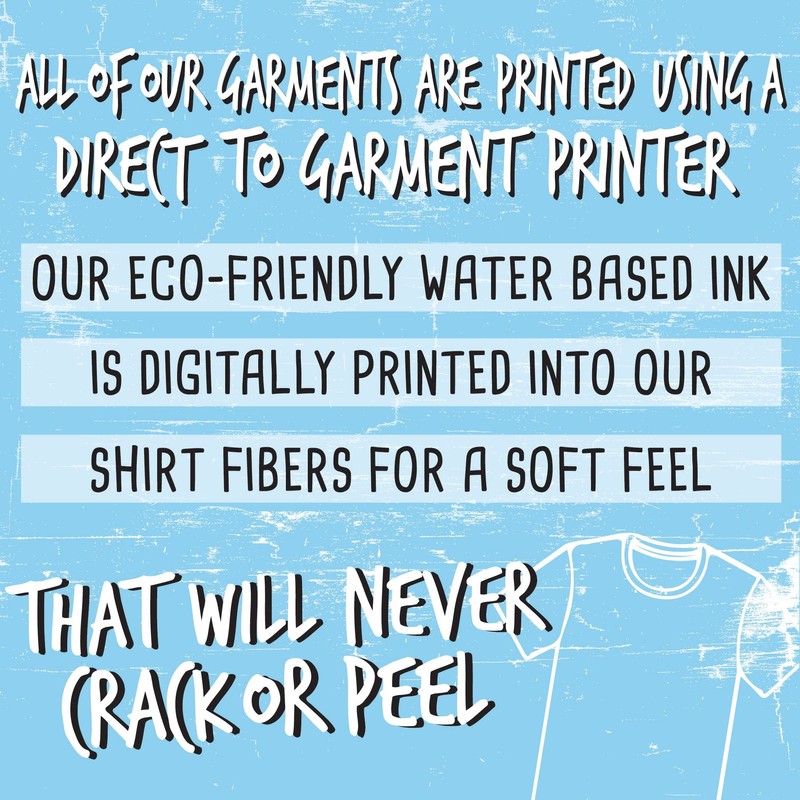 - Our eco-friendly water-based ink prints directly into our shirt fibers for a smooth feel that provides a less vibrant, lived-in look. (No cracking or peeling like screen printing or iron-on transfers)