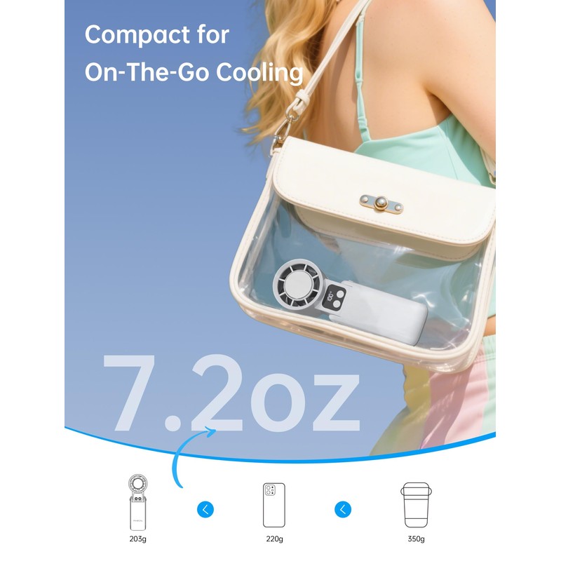 Weighing only 280g, it’s lighter than most smartphones. Pack it in a backpack, purse, or carry-on for travel cooling or camping adventures.