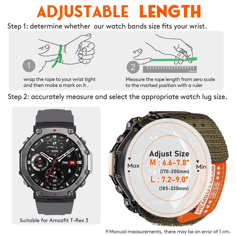 - Sporty and Stylish Design Watch Bands - Crafted from durable nylon, this T-Rex 3 band is built to withstand hiking,fishing,golf,campingand intense workouts. Its lightweight, breathable design keeps you cool, while the adjustable hook and loop closure ensures a secure fit for running, cycling, and more.