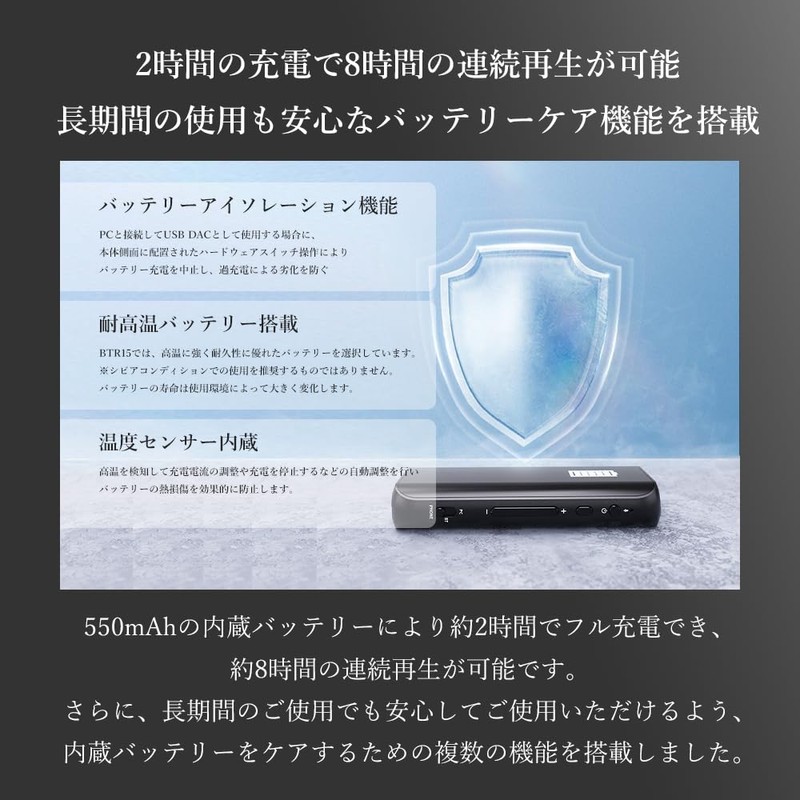- With 2 hours of charging for 8 hours of continuous playback, this BTR15 comes with a battery care function that can be used for a long period of time. The BTR15 has a built-in 550 mAh battery, and the BTR15 can be fully charged in about 2 hours, and can be played for about 8 hours of continuous playback. In addition, it has multiple functions to care for the built-in battery so you can rest assured that you can use it for a long time