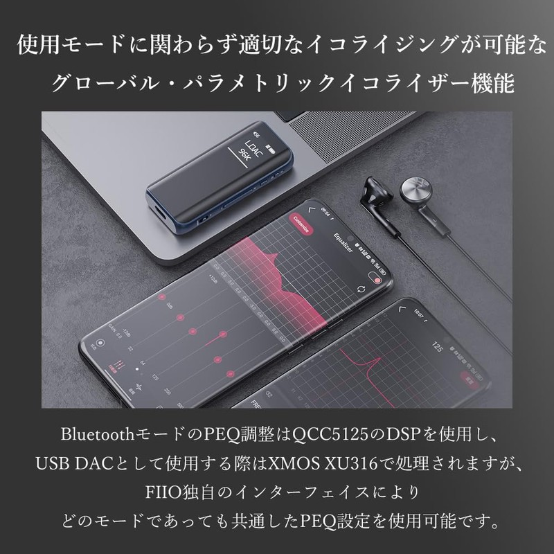 - Global Parametric Equalizer for proper equalization regardless of the mode of use: The BTR15 is equipped with the "Global Parametric Equalizer (PEQ) function developed by FIIO, which allows you to set accurate equalization in both wireless and wired modes. PEQ adjustment in Bluetooth mode is used with QCC5125 DSP, and XMOS XU316 when used as a USB DAC, but FIIO's unique interface allows you to use the common PEQ settings regardless of the mode. When used as a USB DAC, switch the PEQ on or off to reset the USB connection. Please adjust the volume and play the smartphone side again